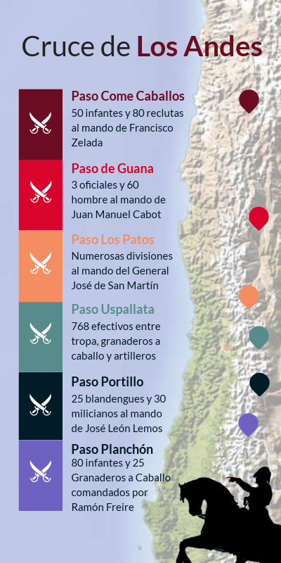José de San Martín con el Ejército de los Andes, en 21 días, atravesó más de 500 kilómetros de montañas, Vencieron a los realistas en Chacabuco y liberaron Chile.