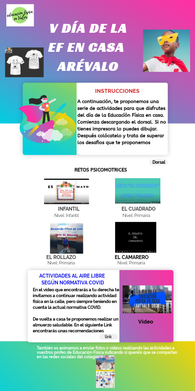 También os animamos a enviar fotos o vídeos realizando las actividades a vuestros profes de Educación Física indicando si queréis que se compartan en las redes sociales del colegio.