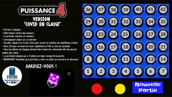 - Formez 2 équipes.- Déterminez l'ordre des joueurs. - Le premier nomme un numéro.. - L'enseignant clique sur ce dernier. - Ensuite, cliquez sur le dé 2 fois pour savoir le nombre de répétitions à faire. - Faire X2 pour un exercice avec répétitions et X6 si c'est en seconde. - Tous les élèves de l'équipe doivent faire l'exercice. demandé afin de pouvoir mettre leur jeton. - La première équipe qui a 4 jetons en ligne remporte la partie.. * IMPORTANT: N'oubliez pas qu'il doit y avoir un jeton au numréro en dessous!