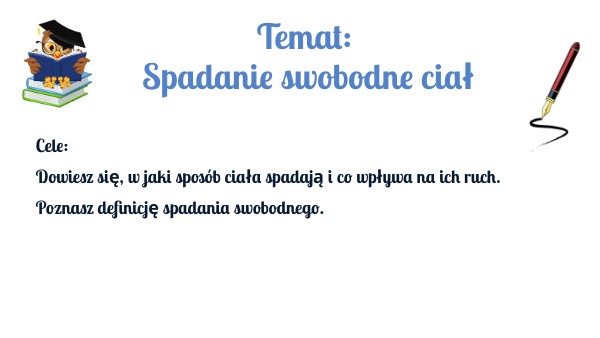 Cele:Dowiesz się, w jaki sposób ciała spadają i co wpływa na ich ruch.Poznasz definicję spadania swobodnego.