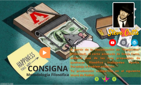 A partir de la visualización de "Happiness" (FElicidad), el corto animado de Steve Cutts, elaborá una de las tres propuestas de quehacer filosófico trabajadas: Aporía, Paradoja o Problematización.Tu producción compartila en el siguiente muro de Padlet