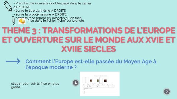 - Prendre une nouvelle double-page dans le cahier d'HISTOIRE - écrire le titre du thème A DROITE - écrire la problématique A DROITE - coller la frise repère en-dessous ou en face