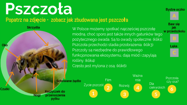 W Polsce możemy spotkać najczęściej pszczołę miodną, choć sporo jest także innych gatunków tego pożytecznego owada. Są to owady społeczne. (klik1)Pszczoła przechodzi stadia przobrażenia. (klik3) Pszczoły są niezbędne do prawidłowego funkcjonowania ekosystemu, dają miód i zapylają rośliny. (klik4) Często jest mylona z osą. (klik6)
