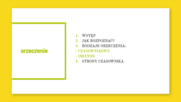 1. WSTĘP2. JAK ROZPOZNAĆ?3. RODZAJE ORZECZENIA: - CZASOWNIKOWE - IMIENNE 4. STRONY CZASOWNIKA