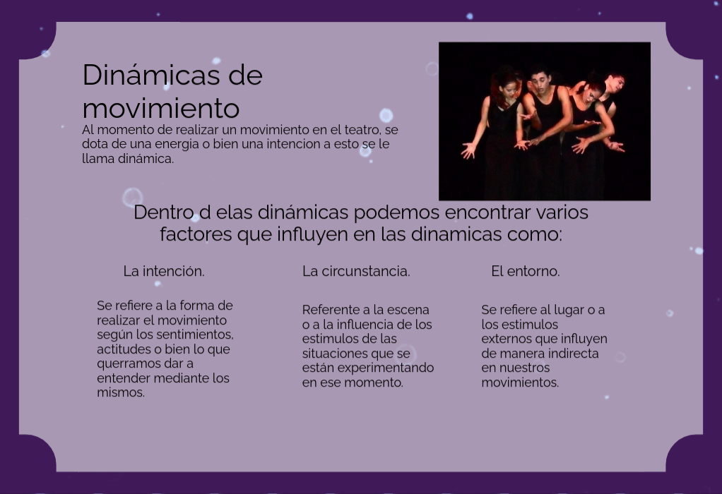 Al momento de realizar un movimiento en el teatro, se dota de una energia o bien una intencion a esto se le llama dinámica.