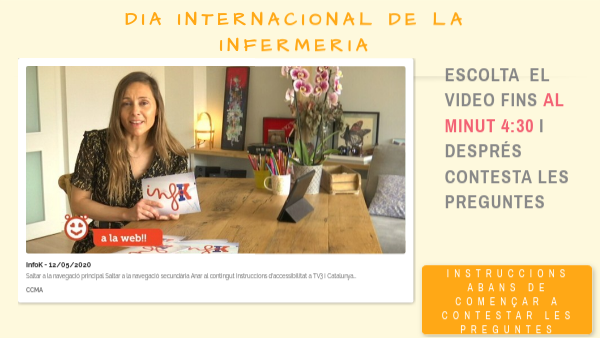 SI JA HEU VIST EL VIDEO PODEU RESPONDRE LES PREGUNTES, SI ENCARA NO L'HEU VIST PREPAREU EL MATERIAL I JA PODEU COMENÇAR. QUÈ NECESSITO: 1. AGAFAR LA LLIBRETA DE CATALÀ (SI NO LA TENIU LA D'EXPRESSIÓ ESCRITA O UN FULL) 2. POSAR EL TÍTOL: COMPRENSIÓ ORAL DIA INTERNACIONAL DE LA INFERMERIA 3. I PREPARAR COM QUAN FEM EL QUINZET, NÚMEROS DE L'1 AL 10 UN A SOTA DE L'ALTRE PER PODER ANAR APUNTANT LES RESPOSTES QUE CREIEU QUE SÓN CORRECTES. 4. UN COP ACABADES LES PREGUNTES COM LES HE D'ENVIAR AL TUTOR? LES HEU D'ENVIAR PER CORREU, PERÒ COM? a) AL ASUNTO HEU DE POSAR: COMPRENSIÓ ORAL DIA DE LA INFERMERIA b) ENVIAR LA FOTO DE LES VOSTRES RESPOSTES