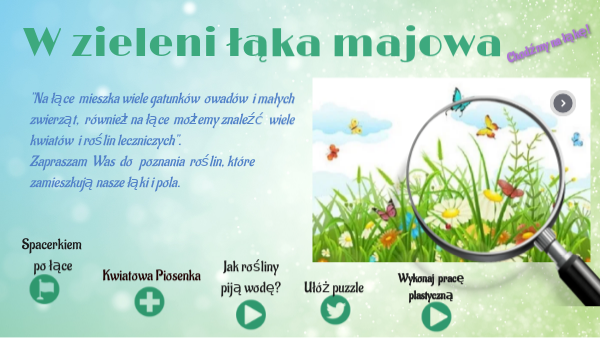 "Na łące mieszka wiele gatunków owadów i małych zwierząt, również na łące możemy znaleźć wiele kwiatów i roślin leczniczych". Zapraszam Was do poznania roślin, które zamieszkują nasze łąki i pola.