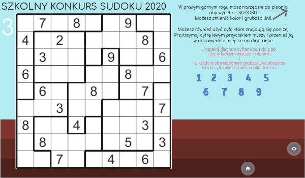 W prawym górnym rogu masz narzędzie do pisania,aby wypełnić SUDOKU. Możesz zmienić kolor i grubość linii. Możesz również użyć cyfr, które znajdują się poniżej. Przytrzymaj cyfrę lewym przyciskiem myszy i przenieś ją w odpowiednie miejsce na diagramie.