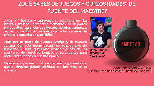 Jugar a " Policias y ladrones", al escondite en "La Piedra Barrueco", compartir momentos de deportes en las calles, aprender de nuestros abuelos y abuelas, reír en un banco del parque, jugar a las carreras de cinta, a la cucaña en San Isidro... Todo eso es parte de nuestro arraigo y de nuestra cultura. Con este juego basado en el programa de televisión: BOOM, queremos revivir algunas de las aventuras de nuestras familias y aprenderlas para poder disfrutarlas en nuestra época. Esperamos que sea un rato en familia muy divertido y que al finalizar podáis disfrutar de los retos si os apetece.