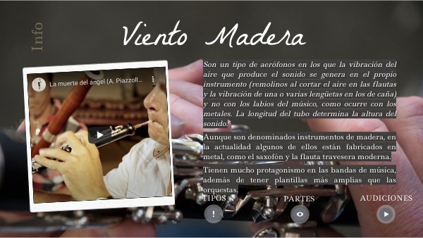 Son un tipo de aerófonos en los que la vibración del aire que produce el sonido se genera en el propio instrumento (remolinos al cortar el aire en las flautas y la vibración de una o varias lengüetas en los de caña) y no con los labios del músico, como ocurre con los metales. La longitud del tubo determina la altura del sonido.Aunque son denominados instrumentos de madera, en la actualidad algunos de ellos están fabricados en metal, como el saxofón y la flauta travesera moderna. Tienen mucho protagonismo en las bandas de música, además de tener plantillas más amplias que las orquestas.
