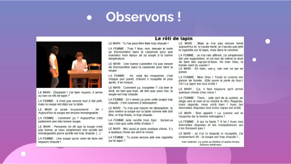 Si chez toi tu as une pièce de théatre regarde comment le texte est construit