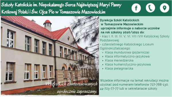 Dyrekcja Szkół Katolickich w Tomaszowie Mazowieckim uprzejmie informuje o naborze uczniów na rok szkolny 2020/2021 do:- klas I, II, III, IV, V, VI, VII i VIII Katolickiej Szkoły Podstawowej - czteroletniego Katolickiego Liceum Ogólnokształcącego:
