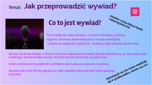 - Podczas opracowywania wywiadu dodaj informację o tym, kim jest rozmówca oraz co będzie tematem rozmowy, nadaj też tekstowi tytuł.