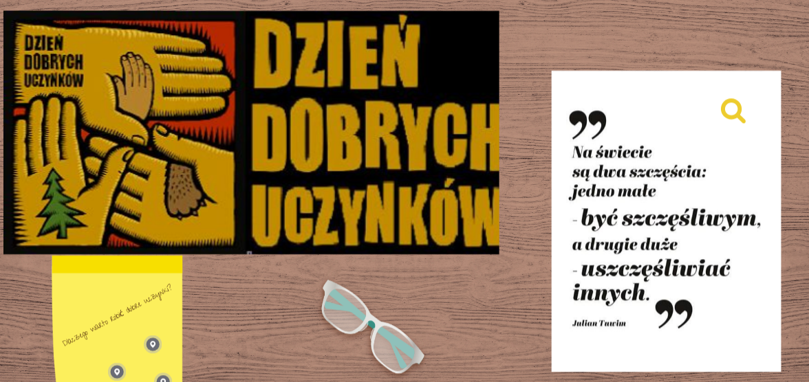 Wesprzyj schronisko przynosząc karmę czy miski dla zwierząt. Posadź kwiatek na trawniku, by cieszył oczy przechodniów. Jest susza. Podlej młode drzewko, kwiaty albo trawnik. Weź udział w zbiórce baterii, nakrętek, pieniędzy na ważny cel. Napisz list do chorego dziecka i życz mu powrotu do zrowia. Przygotuj karteczki z uśmiechniętą buzią i rozdaj je smutnym ludziom. Pobaw się ze swoim zwierzątkiem. Wyprowadź na spacer psa. Wyślij e-mail z podziekowaniem za cieżką pracę do strazaków, czy szpitala. Okazuj szacunek ludziom z obcych krajów. Pomóż odnaleźć drogę osobie,, która się zgubiła. Posprzataj śmieci w swoim otoczeniu lub na wycieczce do lasu. Nie zaśmiecaj środowiska. Segreguj śmieci gdy tylko możesz. Zachęć innych do pomagania środowisku.
