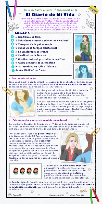 1. Centrando el tema 2. Psicoterapia versus educación emocional 3. Enfoques de la psicoterapia 4. Señas de la terapia existencial 5. La logoterapia de Frankl 6. Finalidad de la técnica 7. Consideraciones previas a la práctica 8. Guión completo de la práctica 9. Autoevaluación. Citas. Enlaces Anexo. Músicas de fondo.