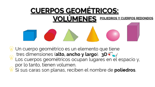 Un cuerpo geométrico es un elemento que tiene tres dimensiones (alto, ancho y largo). 3D Los cuerpos geométricos ocupan lugares en el espacio y, por lo tanto, tienen volumen. Si sus caras son planas, reciben el nombre de poliedros.