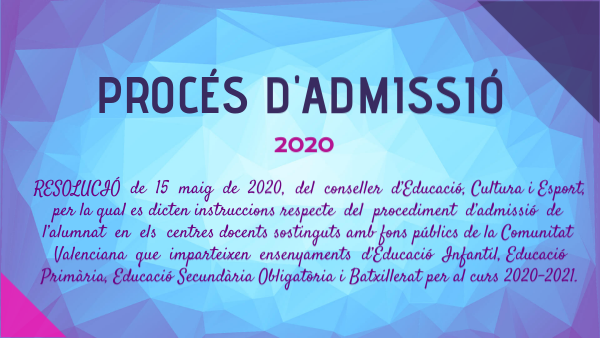 RESOLUCIÓ de 15 maig de 2020, del conseller d’Educació, Cultura i Esport, per la qual es dicten instruccions respecte del procediment d’admissió de l’alumnat en els centres docents sostinguts amb fons públics de la Comunitat Valenciana que imparteixen ensenyaments d’Educació Infantil, Educació Primària, Educació Secundària Obligatòria i Batxillerat per al curs 2020-2021.