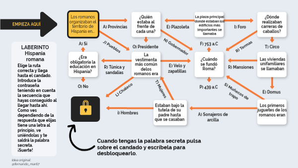 Elige la ruta correcta y llega hasta el candado. Introduce la contraseña teniendo en cuenta la secuencia que hayas conseguido al llegar hasta ahí. Como ves dependiendo de la respuesta que elijas tiene una letra al principio, ve uniéndolas y te saldrá la palabra secreta.¡Suerte!