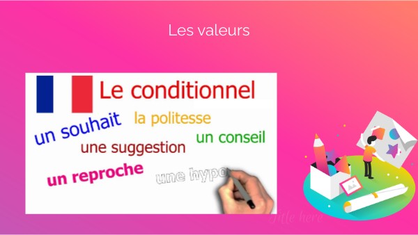d. l’imaginaire Exemples: Imagine: on vivrait sur une île déserte, on serait heureux, on mangerait des fruits et on resterait sur la plage toute la journée. On n’aurait pas besoin de travailler. On pourrait rester là toute notre vie. Ce serait le paradis.