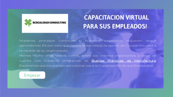 Nuestros procesos continuan y nuestros empleados requieren seguir aprendiendo. Es por esto que hemos desarrollado la opción de Cursos Virtuales a la medida de su organización. Hemos hecho unos videos cortos, sobre los criterios importantes a tener en cuenta con nuestros programas de Buenas Prácticas de Manufactura. Esperamos que los puedan aprovechar para la Capacitación de sus Empleados!