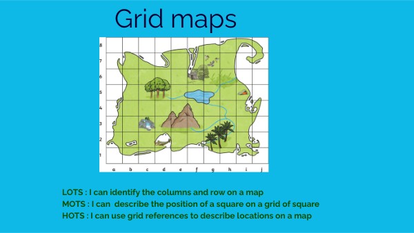 LOTS : I can identify the columns and row on a mapMOTS : I can describe the position of a square on a grid of square HOTS : I can use grid references to describe locations on a map