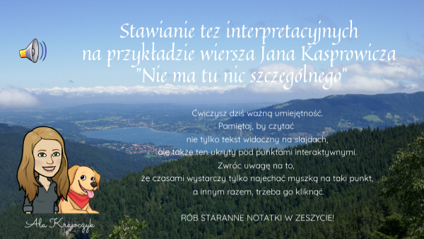 Ćwiczysz dziś ważną umiejętność.Pamiętaj, by czytać nie tylko tekst widoczny na slajdach, ale także ten ukryty pod punktami interaktywnymi. Zwróc uwagę na to, że czasami wystarczy tylko najechać myszką na taki punkt, a innym razem, trzeba go kliknąć. RÓB STARANNE NOTATKI W ZESZYCIE!