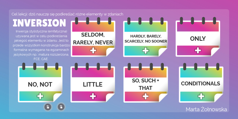 Inwersja stylistyczna (emfatyczna) używana jest w celu podkreślenia jakiegoś elementu w zdaniu. Jest to przede wszystkim konstrukcja bardzo formalna wymagana na egzaminach językowych np.: matura rozszerzona, FCE, CAE.
