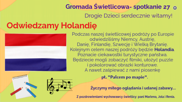 Podczas naszej świetlicowej podróży po Europie odwiedziliśmy Niemcy, Austrię, Danię, Finlandię, Szwecję i Wielką Brytanię. Kolejnym celem naszej podróży będzie Holandia. Poznacie ciekawostki turystyczne państwa. Będziecie mogli zobaczyć filmiki, ułożyć puzzle i pokolorować obrazki konturowe. A nawet zaśpiewać z nami piosenkę