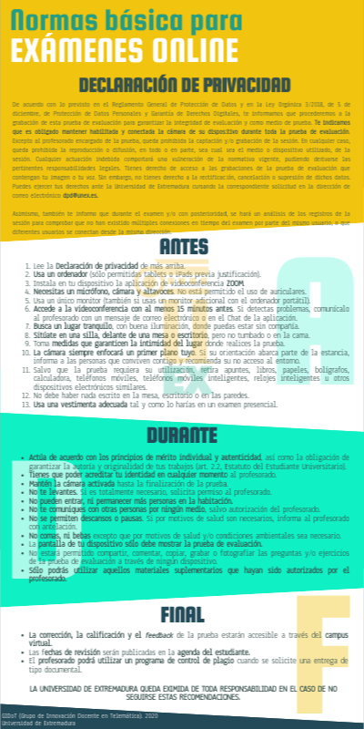 De acuerdo con lo previsto en el Reglamento General de Protección de Datos y en la Ley Orgánica 3/2018, de 5 de diciembre, de Protección de Datos Personales y Garantía de Derechos Digitales, te informamos que procederemos a la grabación de esta prueba de evaluación para garantizar la integridad de evaluación y como medio de prueba. Te indicamos que es obligado mantener habilitada y conectada la cámara de su dispositivo durante toda la prueba de evaluación. Excepto al profesorado encargado de la prueba, queda prohibida la captación y/o grabación de la sesión. En cualquier caso, queda prohibida la reproducción o difusión, en todo o en parte, sea cual sea el medio o dispositivo utilizado, de la sesión. Cualquier actuación indebida comportará una vulneración de la normativa vigente, pudiendo derivarse las pertinentes responsabilidades legales. Tienes derecho de acceso a las grabaciones de la prueba de evaluación que contengan tu imagen o tu voz. Sin embargo, no tienes derecho a la rectificación, cancelación o supresión de dichos datos. Puedes ejercer tus derechos ante la Universidad de Extremadura cursando la correspondiente solicitud en la dirección de correo electrónico dpd@unex.es.Asimismo, también te informo que durante el examen y/o con posterioridad, se hará un análisis de los registros de la sesión para comprobar que no han existido múltiples conexiones en tiempo del examen por parte del mismo usuario, o que diferentes usuarios se conectan desde la misma dirección.