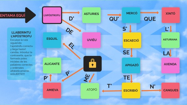 Escueye la ruta siguiendo l'apóstrofu correctu y llega hasta'l candáu. Introduz la contraseña, que ta formada poles iniciales de les pallabres correctes y ordénales alfabéticamente. ¡¡¡¡SUERTE!!!!