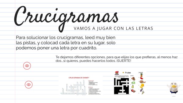 Para solucionar los crucigramas, leed muy bien las pistas, y colocad cada letra en su lugar, solo podemos poner una letra por cuadrito.