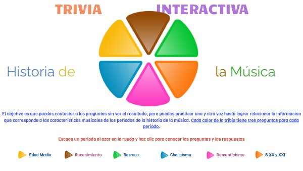 El objetivo es que puedas contestar a las preguntas sin ver el resultado, pero puedes practicar una y otra vez hasta lograr relacionar la información que corresponde a las características musicales de los periodos de la historia de la música. Cada color de la tribia tiene tres preguntas para cada periodo. Escoge un periodo al azar en la rueda y haz clic para conocer las preguntas y las respuestas