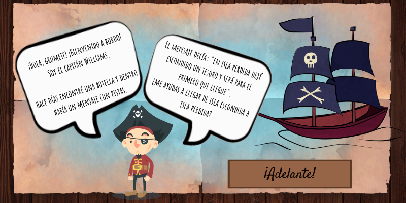 ¡Hola, grumete! ¡Bienvenido a bordo! Soy el capitán Williams. hace días encontré una botella y dentro había un mensaje con pistas.