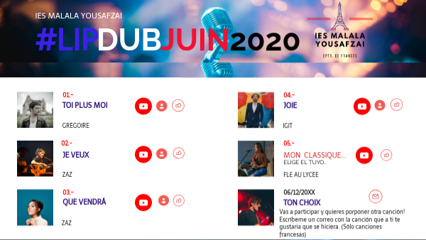Vas a participar y quieres porponer otra canción!Escríbeme un correo con la canción que a ti te gustaria que se hiciera. (Sólo canciones francesas)