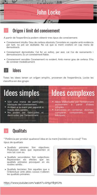 Totes les idees tenen un orígen empíric, provenen de l'experiència. Locke les classifica en dos grups: