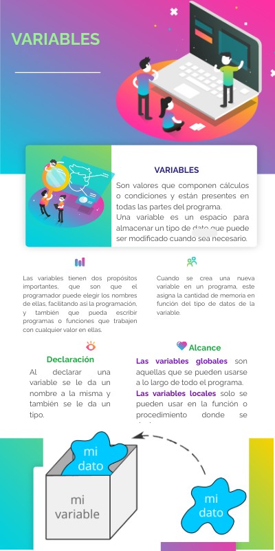 Valores que componen cálculos o condiciones y están presentes en todas las partes del programa. Una variable es un espacio para almacenar un tipo de dato que puede ser modificado cuando sea necesario.