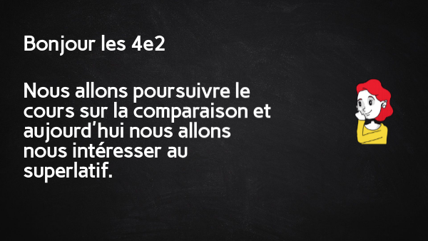 Bonjour les 4e2 Nous allons poursuivre le cours sur la comparaison et aujourd'hui nous allons nous intéresser au superlatif.