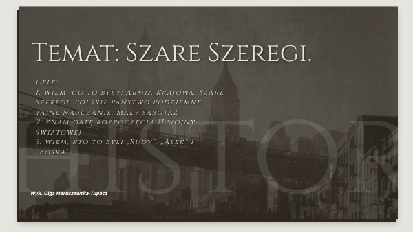 Cele: 1. wiem, co to były: Armia Krajowa, Szare Szeregi, Polskie Państwo Podziemne, tajne nauczanie, mały sabotaż 2. znam datę rozpoczęcia II wojny światowej 3. wiem, kto to byli „Rudy”, „Alek” i „Zośka”