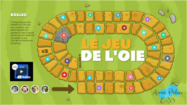 1. Chaque fois que vous tomberez sur une case avec une étoile, vous devrez répondre à la question ou faire ce qui est dit pour avancer. Autrement vous perdre un tour. 2.Les dés sont lancés une fois par tour.