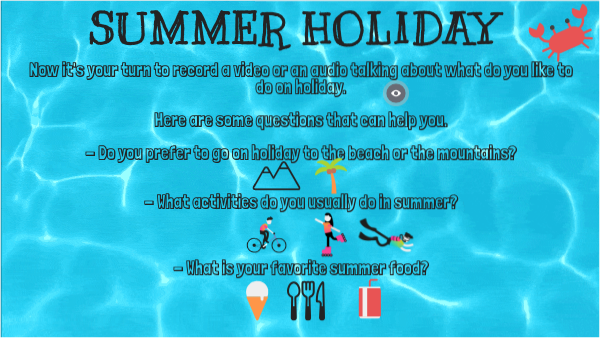 Now it's your turn to record a video or an audio talking about what do you like to do on holiday. Here are some questions that can help you. - Do you prefer to go on holiday to the beach or the mountains? - What activities do you usually do in summer? - What is your favorite summer food?