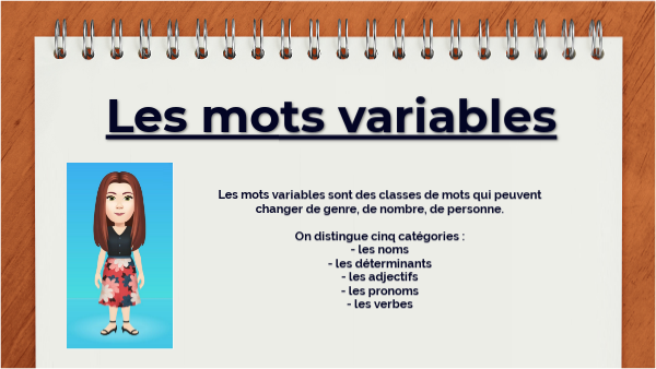 Les mots variables sont des classes de mots qui peuvent changer de genre, de nombre, de personne. On distingue cinq catégories : - les noms - les déterminants - les adjectifs - les pronoms - les verbes
