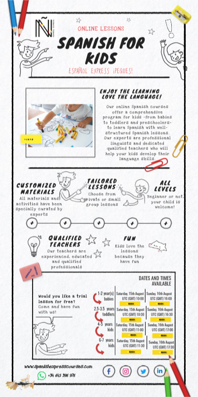 Our online Spanish courses offer a comprehensive program for kids -from babies to toddlers and preschoolers- to learn Spanish with well-structured Spanish lessons.Our experts are professional linguists and dedicated qualified teachers who will help your kids develop their language skills.