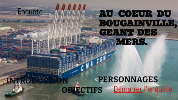 Dans quelques minutes, tu vas embarquer sur le Bougainville. Tu vas te déplacer dans cinq lieux différents sur et à côté de ce porte-conteneur de la compagnie maritime CMA CGM. Dans chacun des lieux tu récolteras un paragraphe, des indications et des chiffres. Le paragraphe est à recopier sur le cahier, les indications t'aideront à compléter le planisphère de synthèse. Les chiffres te permettront à la fin de l'enquête d'ouvrir le coffre présent dans la cabine du commandant et de découvrir le mot de passe que tu me donneras via pronote. Pour avancer, il te sera nécessaire de répondre aux différentes questions. Pour cela, suis les liens et prends les documents distribués sur Pronote. Attention, il est nécessaire de découvrir les lieux dans l'ordre indiquée pour compléter au final le code du coffre. Bon courage matelot.
