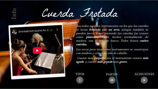 Son todos aquellos instrumentos en los que las cuerdas se tocan frotando con un arco, aunque también se pueden hacer sonar pinzando las cuerdas (se conoce como pizzicato). Están hechos normalmente de madera, con el interior hueco. Todos tienen cuatro cuerdas. Los arcos para tocar estos instrumentos se construyen con madera y crines de cola de caballo. Cuanto más pequeño sea el instrumento sonará más agudo y cuanto más grande más grave.