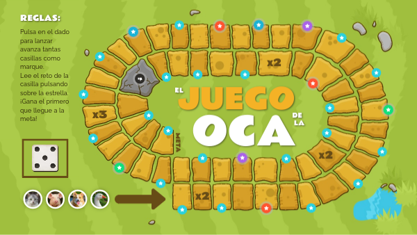 Pulsa en el dado para lanzar avanza tantas casillas como marque. Lee el reto de la casilla pulsando sobre la estrella. ¡Gana el primero que llegue a la meta!