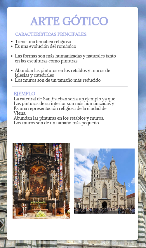 EJEMPLO La catedral de San Esteban sería un ejemplo ya que Las pinturas de su interior son más humanizadas y Es una representación religiosa de la ciudad de Viena. Abundan las pinturas en los retablos y muros. Los muros son de un tamaño más pequeño