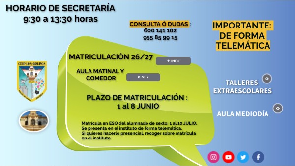 IMPORTANTE: SOLICITUD AULA MATINAL, COMEDOR Y ACTIVIDADES EXTRAESCOLARES EN LA MATRICULACIÓN DE FORMA TELEMÁTICA