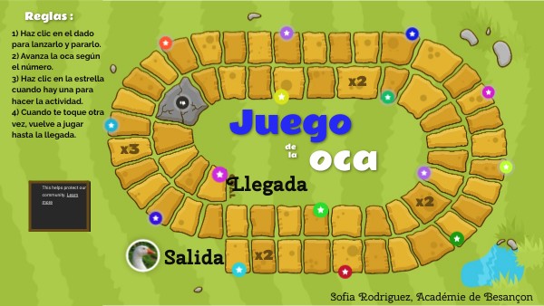 1) Haz clic en el dado para lanzarlo y pararlo. 2) Avanza la oca según el número. 3) Haz clic en la estrella cuando hay una para hacer la actividad. 4) Cuando te toque otra vez, vuelve a jugar hasta la llegada.