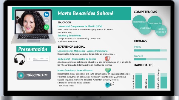 EMPLEOS Actualmente .... Agente Inmobiliario responsable en CONSTRUCCIONES MABELOPEZ S.L. Hasta septiembre 2020 .... UNIVERSO BODY PLANET S.L - Responsable de ventas - www.bodyplanet.es Amplio conocimiento del sistema educativo y más concretamente en el ámbito de las TIC, participando de forma activa en multitud de eventos (Jornadas de inclusión Digital, Eventos de Centros Innovadores, Aumentame, SIMO, etc).INNEVA PHARMA S.L / INNEVA SOLUTIONS - Responsable de ventas - www.innevapharma.esResponsable de dar soluciones a la carta para impactar en equipos profesionales y clientes. Innovando en acciones de formación (Teambuilding y Aprendizaje basado en juego), marketing (Realidad Aumenta y Virtual) y eventos. 2008-2016..... Dirección en Restauración. Responsable de compras, trato con proveedores. Recursos Humanos. Finanzas y Contabilidad. Relaciones Públicas, responsable de marketing y Redes Sociales. 2008-1999........ Operador técnico de Emisión en Telson para Disney Channel. Control de Calidad. Manejo de editora Sony PVE 500 y Betacam Digital DVW-500P. Visionado y posterior corrección de series y películas emitidas en Disney Channel. OPERADOR DE EMISIÓN en Canal 7 TV de Madrid. Dominio del programa PlayBack, para manejo de Flexicart de Sony. Sistema V-Tools de Sony para almacenamiento de programación en disco duro. Control de calidad y programación. CINE COMPANY - Responsable promoción película "Taxi Driver" TERRITORIAL DE TVE - Ayudante de ENG para los informativos (Colaboración IMEFE). ANTENA 3 TELEVISIÓN - Meritoriaje en los departamentos de dirección (guiones, script), producción, cámara y montaje. Serie "Este es mi barrio" . DIRECCIÓN: José Antonio Escrivá. ESTUDIOS PRÁCTICOS 2020 .... Certificado Google Actívate en Fundamentos de Marketing Digital (40 horas). 2018 …… Curso de “Gestión de Ventas, Marketing Directo y utilización de Redes Sociales en la Gestión Comercial” (100 horas). 2014 …… Curso de WordPress (77 horas) 2011 …… Curso de Community Manager en la Web 2.0 (77 horas) 2005 ...... Curso de maquillaje y caracterización (120 horas). 2003 ...... Curso Animación 3D (3D Studio Max 5) de 106 horas en el CES. Diploma acreditativo. 2002 ...... Curso AVID (Xpress y Composer) de 60 horas en el CES. Diploma acreditativo. 2001 ...... Curso Drake, D-Mas System operator, impartido por DAL.Training Manager: Richard Hewitt. 2000 ...... Curso de VIDEO DIGITAL impartido en el CES. 1998 ...... CÁMARA plató y ENG en AULA´98 en los estudios de RTV instalados por el IMEFE. 1995 -97 ...... Cursos de Fotografía impartidos en la Facultad y en el Ayto. de Barajas. 1995- 96 ...... Curso de informativos en RVK (Radio Vallekas) y posterior realización de un programa de cine durante el curso ´95-´96.