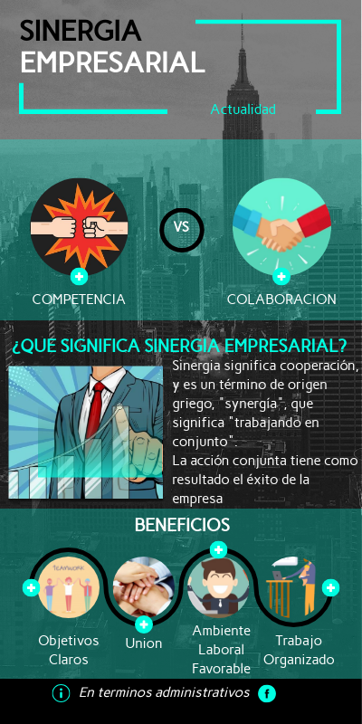 Sinergia significa cooperación, y es un término de origen griego, "synergía", que significa "trabajando en conjunto".La acción conjunta tiene como resultado el éxito de la empresa